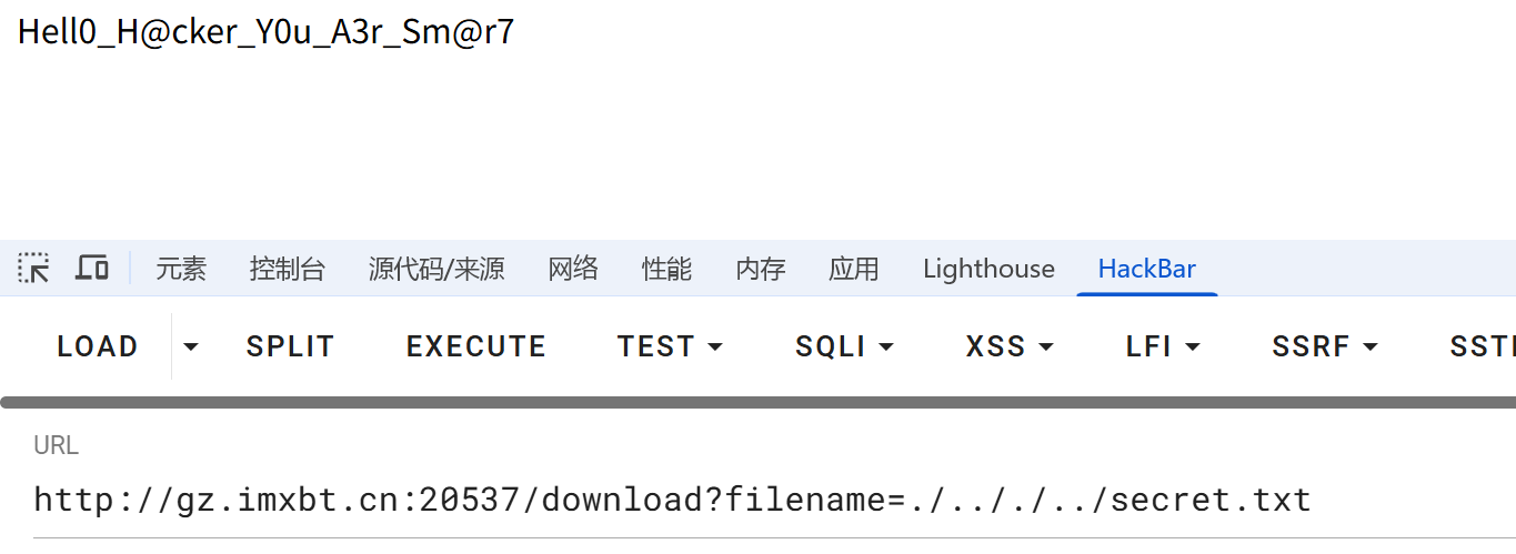 我们得到了 secret.txt 的内容:Hell0_H@cker_Y0u_A3r_Sm@r7
