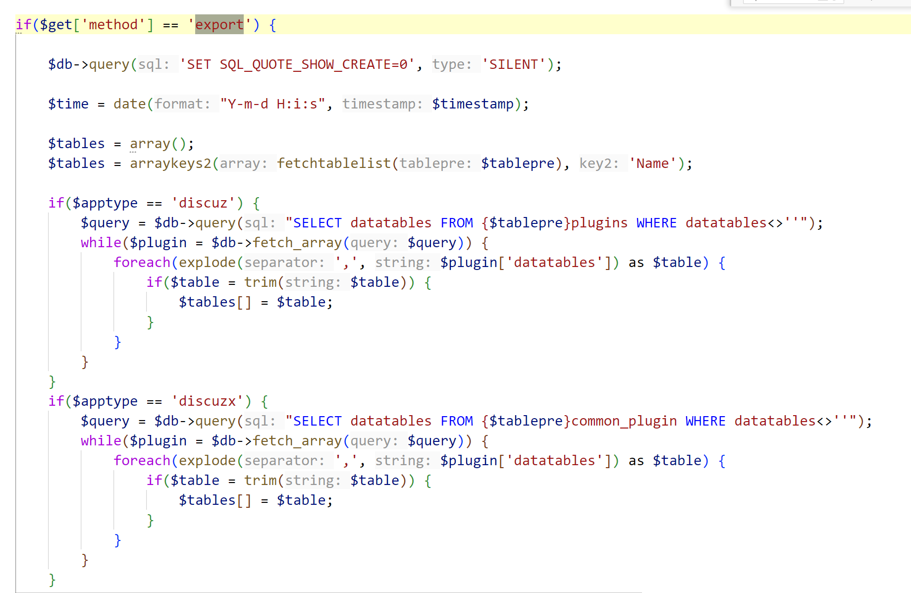 1 2 3 4 5 6 7 8 9 10 11 12 13 14 15 16 17 18 19 20 21 22 23 24 25 26 27 28 29 30 31 32 33 34 35 36 37 38 39 40 41 42 43 44 45 46 47 48 49 50 51 52 53 54 55 56 57 58 59 60 61 62 if ($get['method' ] == 'export' ) { // 如果传入的参数 method 等于 export,就执行导出逻辑 $db->query('SET SQL_QUOTE_SHOW_CREATE=0' , 'SILENT' ); // 设置 MySQL 的 SHOW CREATE TABLE 不使用反引号(让导出结果更简洁) // 'SILENT' 表示执行失败也不会报错 $time = date("Y-m-d H:i:s" , $timestamp); // 把时间戳格式化成人类可读的时间,用于记录导出时间 $tables = array(); // 初始化表名数组 $tables = arraykeys2(fetchtablelist($tablepre), 'Name' ); // 获取所有表名(fetchtablelist 按表前缀 $tablepre 获取) // arraykeys2(..., 'Name' ) 提取结果中的 'Name' 字段作为表名列表 if ($apptype == 'discuz' ) { // 如果是 Discuz! 环境 $query = $db->query("SELECT datatables FROM {$tablepre}plugins WHERE datatables<>''" ); // 查询 plugins 表,取出 datatables 字段(插件可能会自己创建数据表) while ($plugin = $db->fetch_array($query)) { // 遍历每一个插件记录 foreach(explode(',' , $plugin['datatables' ]) as $table) { // 把 datatables 按逗号分隔成一个个表名 if ($table = trim($table)) { // 去掉空格,确保表名有效 $tables[] = $table; // 把插件的表名加入到 $tables 列表里 } } } } if ($apptype == 'discuzx' ) { // 如果是 Discuz! X 环境(新版) $query = $db->query("SELECT datatables FROM {$tablepre}common_plugin WHERE datatables<>''" ); // 查询 common_plugin 表,Discuz!X 把插件信息放在这个表里 while ($plugin = $db->fetch_array($query)) { // 遍历每一个插件记录 foreach(explode(',' , $plugin['datatables' ]) as $table) { // 把 datatables 按逗号分隔成一个个表名 if ($table = trim($table)) { // 去掉空格,确保表名有效 $tables[] = $table; // 把插件的表名加入到 $tables 列表里 } } } } }
