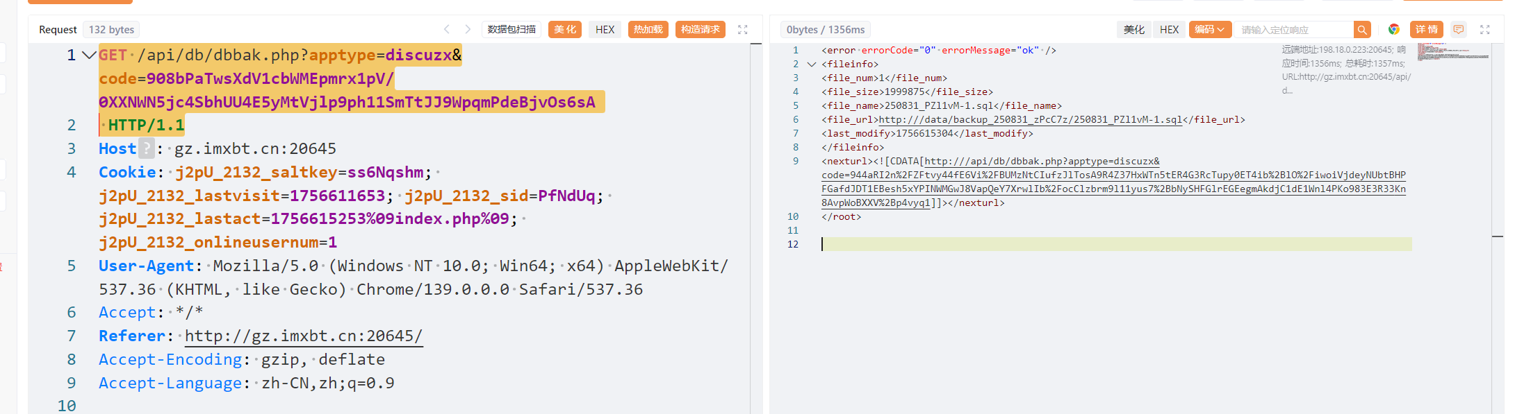 1 2 GET /api/db/dbbak.php?apptype=discuzx&code=908 bPaTwsXdV1cbWMEpmrx1pV/0 XXNWN5jc4SbhUU4E5yMtVjlp9ph11SmTtJJ9WpqmPdeBjvOs6sA HTTP/1.1